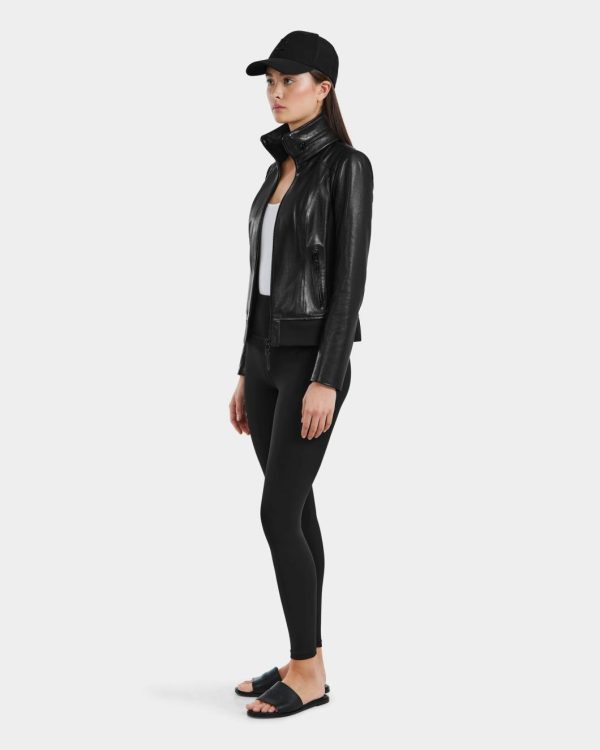 The REBECCA by RUDSAK is a must-have fitted lamb leather jacket that combines sporty sleekness with timeless design. Crafted from supple leather, this moto-inspired bomber features tonal black hardware for a modern, streamlined look. Designed with a high-neck collar and a zippered lightweight hideaway hood, it offers both practicality and style. An elevated essential, the REBECCA is the perfect layer to transition seamlessly through the seasons.